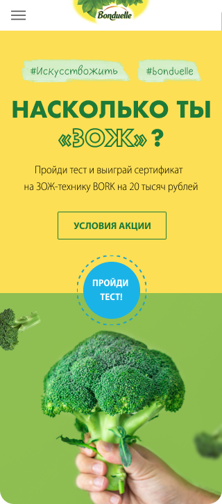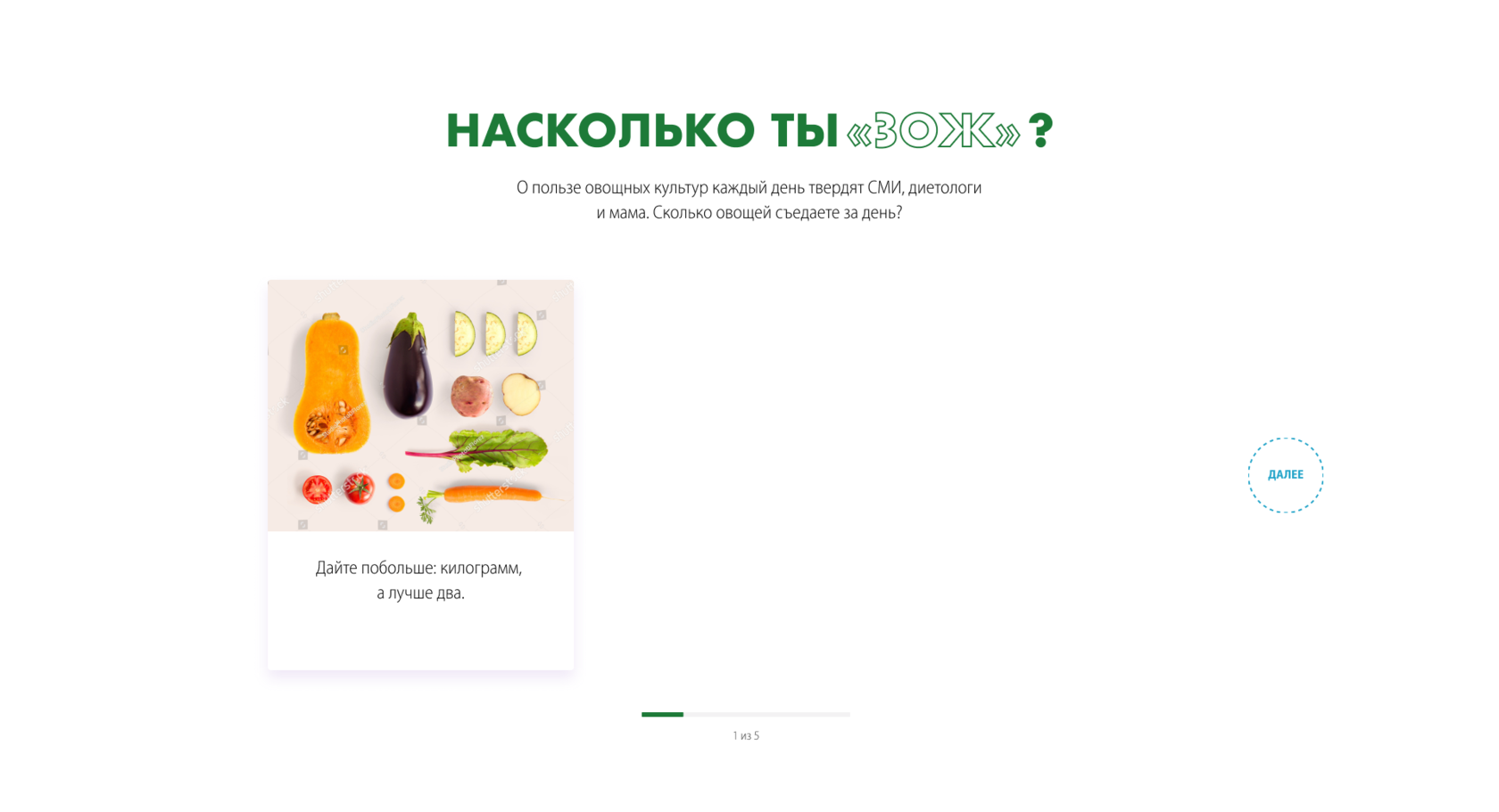 The Goal: to create a landing page with a test 'How deep is your Healthy Life Style?'. User should have pass the test and share the result in socials to get the prize.